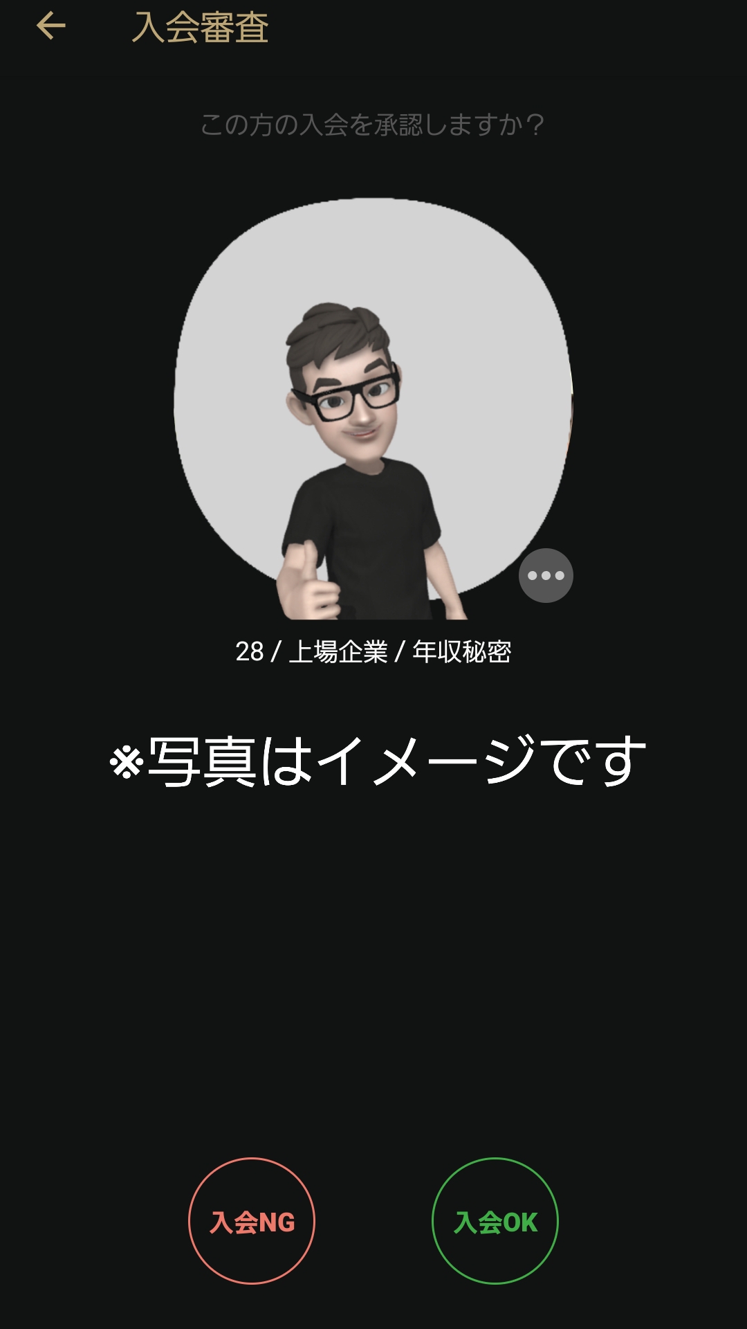 このように、新規入会希望者の写真・年齢・職業・年収が表示されます。その下に入会OKまたは入会NGをクリックする箇所があります。